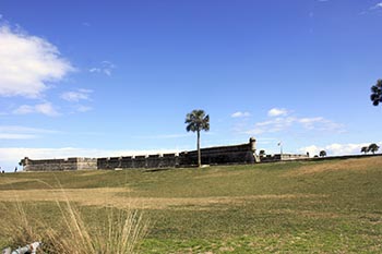 In 1565 Conquistador Pedro Menendez de Aviles, accompanied by 600 soldiers and colonists arrived in Florida to establish a series of “presidios” (fortified towns) to defend treasure-laden ships en route back to Spain. Construction of the Castillo de San Marcos, the most northerly of these presidios, was essentially complete by 1695. The bastion design allowed defenders to mount cannons in such a way as to get a clear shot at the enemy from every possible angle.