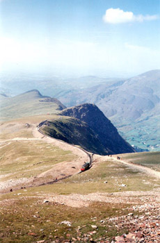 The morning after my arrival, I set off with the intention of climbing at least part way up the mountain. It was early June, fine weather for walking, but Snowdon’s conical peak was still shrouded with a thick, furry cap of gray cloud. I was well prepared for the trek: comfortable walking shoes, a layer of warm clothing, a rucksack packed with waterproofs, first-aid kit, whistle and local map. Still, the weather looked unpredictable, and after careful thought, I opted to ride up on the little single-track locomotive run by the Snowdon Mountain Railway. The train goes right up to the summit, a long slow haul of 55 minutes.
