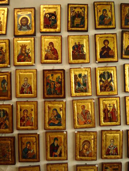 Dimitris Zazanis is a dignified, genteel man who speaks fluent English as well as several other languages. Put in other circumstances he might have had a university career in linguistics. He tells me that he used to have a more favourable location in Plaka some years ago, but due to hot real estate which raised his rent and health issues that put him on the sidelines for some time, he was forced to move his workshop to this other location which, unadvertised, is not a likely place for tourists to come upon. His customers are drawn to his shop mainly by word of mouth. The icons he paints are of high quality and beauty and his prices are probably the lowest in Athens for these beautiful hand-crafted works of art. He has some ready-made icons as well, but always adds his own creative touch to them.