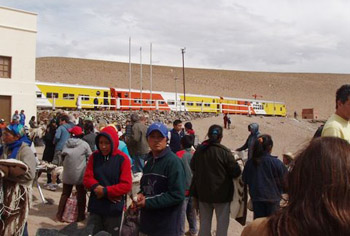 For the next fourteen hours, the train’s ascension through multiple bridges, tunnels and spirals brings me higher than the clouds. The yellow and orange wagons contrast with the clear blue sky, as they zigzag through the unspoiled valleys of cardones, cacti taller than men and along multicolored canyons rich in silver, iron, lead and manganese. In the middle of this serene countryside, the sound of a helicopter as the train comes to a stop, creates some havoc. We are told that the altitude caused a passenger to faint and is brought to Buenos Aires. Once the climb resumes and calm is restored, we reach the Puna, high plateaus where herds of llamas roam. At La Polvorilla, close to the Chilean border, is where the train crosses the last viaduct, a sixty-four meter high metal structure. It’s the trip’s highlight and the altitude is 4,220 meters above sea level. Despite being out of breath due to the lack of oxygen, I’m grateful to have made it this high, so that I can enjoy the breathtaking view of the desert canyon below.