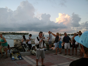 As I got closer to Mallory Square to view my first Key West sunset, the sounds of blues music and the humming of the crowd dominated as I arrived at the adjacent outdoor restaurant called Sunset Pier. Many folks were snapping pictures as the setting sun tried to make it to the horizon before being overtaken by massive clouds, even while sailboats continuously darted across the gulf. At the square were other sights and scents I took note of, including the heavenly scent of buttered popcorn mixed with the saltiness of the sea, various musical and theatrical acts (which one performer employed his dog to take tips from the onlookers’ hands and deposit it in a bucket). One outspoken guy was selling Jesus to the onlookers as if Mallory Square were the tropical version of London’s Speakers’ Corner.