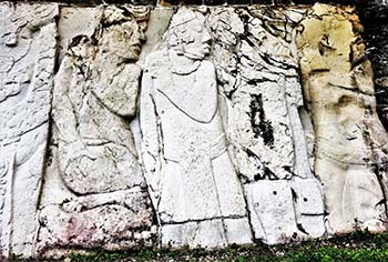 The intricate mosaic fretwork on the walls of the archeological site at Mitla may be the inspiration for the geometrics woven into carpets and embroidered on cloth. Every stone was meticulously carved and put in place without mortar. A testament to the artistry.)