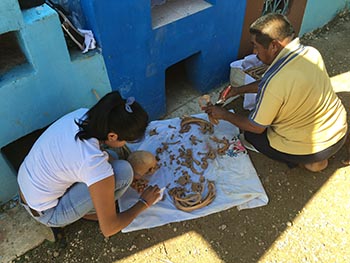 7th generation master weaver Demetrio Bautista Lazo and his wife, Maribel, are the consummate hosts. Demetrio is world-renowned not only for his weavings, but for his old school, yet innovative dying techniques. Wearing his infectious grin, he shares grinding the cobalt, boiling the yarn in the mixture, and hanging it to dry in the sunshine where it turns a luxurious deep blue. The weaving on his loom is a masterpiece in blue and cream