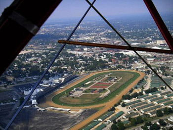 Commercial airline travel for most of us has become something to endure. But I had a flying experience that rekindled the romance of flying via Classic Biplane Tours. I flew over Louisville at 1500 feet above ground in a replica open cockpit 1935 WACO YMF, built in 1993 (with more technically advanced features for safety). It’s also known as “Big Red”. The top speed reached 90 M.P.H. I felt the wind in the back of my neck as I took in some incredible views and pictures of the Louisville area, including Churchill Downs (below), Louisville’s skyline, and some Indiana farmlands in mostly clear and sunny skies, covering around 40 miles of flying. Even the airport we took off from goes back to glorious aviation days past – that being Louisville’s first major airport, Bowman Field, which is now used mainly for smaller private planes.