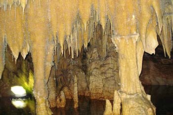 The first cave is known as the Glifada Cave, one of the most beautiful lakes caves in the world. Brilliant white stalactites and stalagmites glitter from the ceiling and rise from the water like crystal drapes. Water seeps into the cracks of limestone and drips into the underground lake, making a pleasant trickling sound. The passages are sometimes so low and narrow we have to duck our heads as the punt slides underneath and we enter another breathtaking cavern. The boatman tells us to keep our hands inside and not to touch anything in the caves.