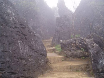 What goes up must come down. So we do. At the bottom of the other-side of the mountain, two guys with motorbikes motion to us to jump on and ride back to town in the cold, wet fog. They drop us off at Ham Rong Mountain, which has the shape of a Dragon, so Ting says. We skitter up steep, wet rocks and find a collection of orchids, with some in bloom. I am gasping for air when Ting announces we are now near the Gateway to Heaven. I realize once again that life unfolds when you least expect it.