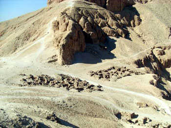 For the more adventurous travellers, I would strongly recommend following in the workmen’s footsteps by taking the ancient desert track that leads from the south-west corner of the village, over the mountain ridge and down into their place of work, the Valley of the Kings. It is by no means an easy walk, with the track becoming quite steep and treacherous in places. Simply put, it should only be tackled by the physically fit and those with experience of traversing uneven and tricky terrain. For first timers, it is definitely advisable to seek out the services of one of the local guides, who will gladly offer the service of a donkey for those unaccustomed or unable to make the journey on foot.