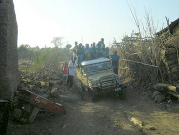 Each mini-bus can comfortably sit eight to twelve persons. With tremendous fanfare everyone crammed into the buses, fifteen people inside each one, another fifteen sitting on the roof, clinging to the hood, or standing on the back bumper. Many of the passengers pounded their drums, and the others ululated. The road, a dusty obstacle course of rocks and craters, teemed with children, chickens, goats, tractors (without brakes), donkeys and cows. The drivers proceeded very slowly, the buses swaying from side to side. Accompanied by singing clapping and drum beats, we inched our way through the center of town towards the home of Yohannes’ bride.