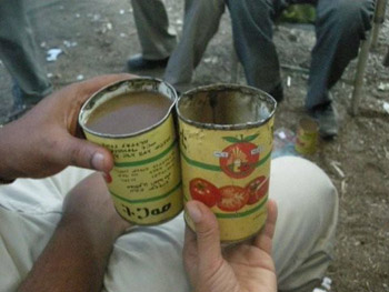 Ethiopian food is delicious. Every meal begins with injera – a thin bubbly pancake with a slightly sour taste, made from sorghum or tef. The injera is laid flat on a giant plate in the center of the table. Flavourful stews and sauces are heaped on top. You tear off a portion of injera and use it to mop up the sauces and carry the meat to your mouth. This meal was accompanied by copious amounts of the thick brown fermented tella, stored in giant open barrels and served in tin cans. By using recycled tin cans for cups you never have to worry about setting your glass down and confusing it with someone else’s. “This 28 oz can of tomato paste? Oh yes, that’s my cup. Thanks. This tin of tuna must belong to you.”