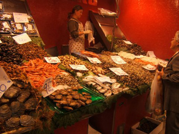 La Boqueria market is a sensory onslaught of colours, smells, excitement, and seafood just off Las Ramblas. Drop in for a snack: try fresh pressed exotic juices, savory bites from one of the renowned tapas bars within the market, or a glass of sangria. I chose a sangria at one of the bars and was told by the non-English speaking patron, “Fort, fort.” Holding up two fingers, he tapped the glass, and made a spiral gesture beside his head with two fingers.