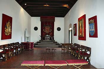 Now restored, the front façade reflects the Mudejar style common in 16th century Spain. The furnishings represent the age but are not original to the family. Passing through the front door into the foyer, a mounted suit of armor ushers you into the dining room. Used for formal government functions, this dining room contains a dark wooden dining table and cabinets. A gargoyle to the right of the door kept diners safe from evil spirits. As an additional precaution, a food taster sampled everything before guests began their meals.