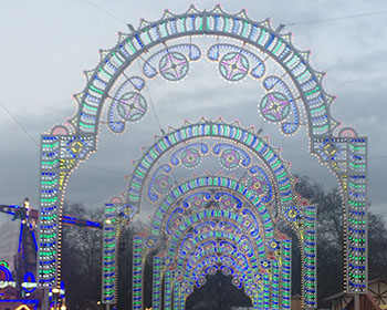 The lighted arched entranceway to Winter Wonderland at Hyde Park, London