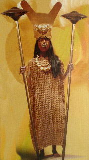 The 1,600 year old mummy was elaborately wrapped in an enormous, gold encrusted bundle, surrounded by precious adornments and exquisite, intricate gold jewelry; and, with all the trappings of a powerful, supreme ruler and warrior; including two long, massive, gold covered war clubs and 23 spear throwers. A bowl of solid gold covered the face