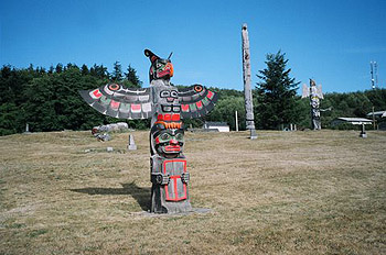 As my companion and I wound through the forest and mountains of Vancouver Island from Nanaimo up to Port MacNeil, my thoughts kept returning to the mystery of what lay ahead. I was nearing the end of my journey from the prairies to Alert Bay on Cormorant Island, a short ferry ride from Port McNeill, British Columbia. And I was bringing with me the crest from HMCS Quesnel, the corvette my father had served on in World War Two. This crest had embroidered on it the image of a thunderbird totem, a totem that I had discovered originated from a burial ground at Alert Bay, British Columbia. Some of the crew had snatched this grave marker while on shore the summer of 1942 and it had become their mascot until the end of the war.