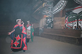 Up the hill in the Big House we learned more about their history and culture. There we watched the dancers (photo right) step to the beat of the music pounded out on a cedar log – dances that told of stories and legends through the use of masks and costume. It was a spectacular and moving sight, watching them circulate around a fire in the middle of the earthen floor.