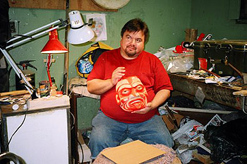 Walking further along Front Street we passed houses with people sitting out on the verandas carving masks and totems. The U’mista Cultural Center (photo at bottom) at the far end was situated beside the derelict remains of a faded brick residential school, that had closed some thirty years earlier. The old shop in the basement of the school was used as a workroom for carvers. (Photo left of Sean Whonnock)