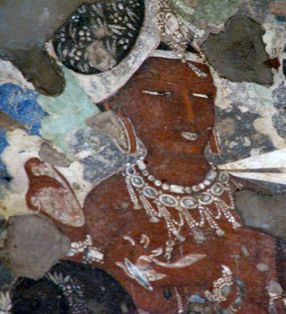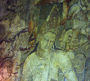 As I stand in the shadowy interior of the first cave, I’m reduced to stunned awe. The walls of the hall are a riot of murals that have endured in varying degrees of preservation over the millennia. At the far end of the room a statue of a benevolent Buddha gazes down at visitors. I’m riveted by what is probably the most photographed image in Ajanta, a painting of Bodhisattva Padmapani (left). The elegant prince, bedecked with pearls, holds an open lotus, signifying the awakening of the mystical inner self. With his golden skin, gentle smile and dreamy almond shaped eyes, he radiates a timeless serenity.