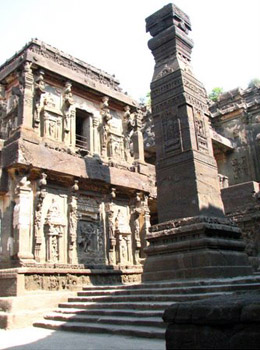 The Kailasa temple (right) is dedicated to the Hindu god Shiva whose abode in the high Himalayas is at Mount Kailash. Designed to resemble a chariot, the temple is in three parts: a dome-shaped sanctum enshrining a Shiva lingam (a phallus shaped stone symbolizing Shiva’s power), the main temple which is a large pillared hall, surmounted by four rampant lions, and a secondary smaller temple just above the main entrance.
