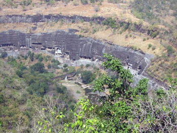 Just a couple of hours drive out of the busy town of Aurangabad (in the state of Maharashtra), I stand on a high bluff, looking down at a horseshoe shaped basalt cliff pockmarked with entrances to 29 caves (above). Ant-sized people crawl along a paved pathway and in the ravine far below, the Waghur river snakes through the jungle foliage. These are the Buddhist caves of Ajanta, built between 200 B.C. and 650 A.D. Lost to the world until 1819, it was a British Army officer, John Smith, who stumbled on them while on a hunting expedition in the area.