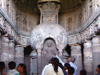 The word “buddha” means awakening (to enlightenment) and the Bodhisattvas whose images throng the walls of Ajanta’s caves are those aspiring to attain Buddhahood. Prince Siddharath Gautam, who achieved full spiritual enlightenment in the 6th century B.C. is the founder of Buddhism, and these caves were once inhabited by thousands of monks seeking to follow his eight-fold path of righteousness. Five of Ajanta’s caves were prayer or assembly halls enclosing stupas (symbolic representations of the Buddha); the rest were halls of residence. Buddhists, Jains and Hindus lived in harmony back then, and a great majority of Ajanta’s artistic masterpieces were created by under the patronage of a Hindu king Harishena who lived in the 5th century A.D.