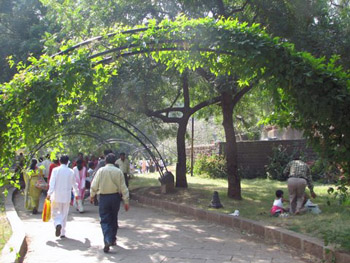To keep air pollution to the minimum, no private vehicles are allowed beyond this area. A green bus powered by natural gas, pants to a halt at the depot. A crowd materializes elbowing me aside as they claw and shove their way into the vehicle. I look at Amod and shrug as the bus lumbers out, packed to the rafters with babbling, excited Indians. He grins. “Leave it to me—I’ll get you onto the next one!” He’s as good as his word. He fights to the front of the seething mass of passengers, sits himself down and reserves a spot for me on the seat next to him. Getting off the bus at the foot of the caves, we walk through a landscaped garden rich with bougainvillea creepers and the scent of frangipani blossoms (above).