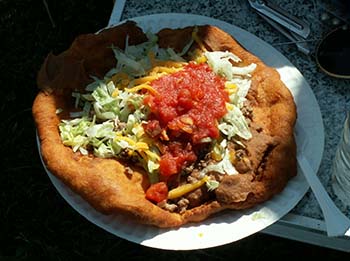 The stalls offered sweet fry bread sprinkled with powdered sugar and cinnamon for four dollars and savory Indian tacos, which seemed slightly less unhealthy, for five dollars.