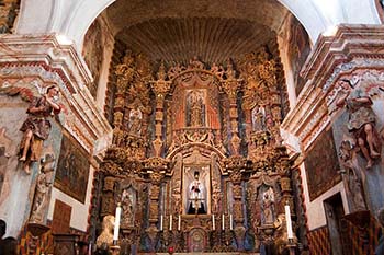 The front of the church is dominated by a high golden altar, the design of which parallels the façade outside. It is covered with labyrinthine decorations and saints posing in alcoves. In the center a giant image of a priest in a black robe overlaid with a white surplice, Saint Francis Xavier himself, presides over the milling crowds of sightseers.