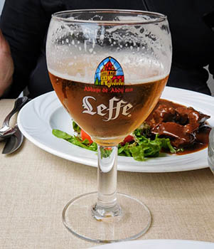Of course, nothing goes better with vlaamse stoverij than one of the over 800 varieties of famous Belgian beer. Here at the Vivaldi, it is Abbey beer. I order a glass of Leffe Blond. My server Stef talks about the beer with great enthusiasm. This beer, he says, dates back to 1240 A.D. when it was made by the monks of the abbey of Notre-Dame de Leffe in southern Belgium using ingredients found in the wild. It’s a deep yellow color, strong and malty with a subtle orangey taste and a high alcohol content, and he proudly serves it in a special Leffe glass. It pairs very well with the vlaamse stoverij. I’m somewhat disappointed to learn that today it’s produced by an arm of Anheuser-Busch, although royalties are paid to the abbey for their production.