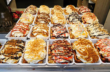 I’m now ready for some dessert and nothing is more enticing than Belgian waffles. This is a very popular indulgence in the evening. Like frites, Belgian waffles are made in little waffle stands throughout the pedestrianized areas of most cities and towns and are served with a fork and a special waffle holder. Emilie makes one for me using a waffle iron and corrects me—here they are called simply “waffles”, not Belgian waffles. She offers a choice from a variety of toppings including whipped cream, icing sauce, butter, pistachios, candy sprinkles, shaved chocolate, coconut, banana, fresh strawberries, Nutella and drizzles of chocolate, caramel, or strawberry sauce.