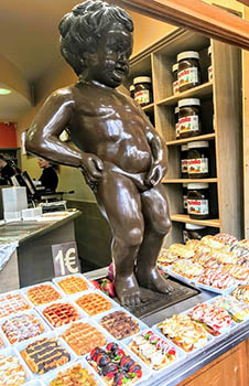 Chocolate reached its apex as an art form when in 1912 Jean Neuhaus in Brussels invented the chocolate bonbon. The chocolatier designed and sculpted beautiful confections out of the rich, smooth paste. Now, as I stand at shop windows mesmerized by the beauty of the creations, I am humored by a window displaying a three-foot tall chocolate Manneken Pis who threatens to destroy a sheet of waffles with his discharge. Inside, you can buy bags of the little guy made out of white, milk and dark chocolate and tied with a blue bow.