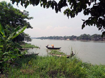 We cross a modern bridge over the huge River Shittalakka, which is a tributary of the mighty Brahmaputra, and turn left into an alleyway. Soon the road is too narrow for the car, so we get out and walk along a brick-paved path skirting the river bank. There are small shops along both sides, selling everything from kapok to bananas and skeins of colourful yarn.