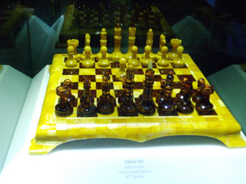 Replicas of famous pieces from the St. Petersburg Winter Palace and Amber Room catch the eye in the middle of the room. There is a jewellery chest and a set of chess made from different coloured amber, all held together by hooks and cuts without the use of a single drop of glue. It’s not only the amber which fascinates the visitor but also the extraordinary skill and craftsmanship which have created these stunning pieces.