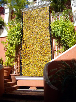 Although I walked past the entrance on my first attempt, I knew nevertheless that I was in the right place, because on the next landing was a stunning sight: a waterfall cascading down two stories and made of over 12,000 individual pebbles and pieces of amber from all over the world. Water is running over the amber and the reflecting sun gives the impression that you are looking at a waterfall of pure gold.