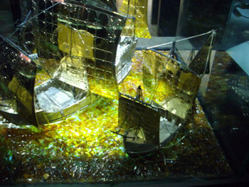 “Look at the Caribbean take on Columbus’s arrival in these waters,” the girl said. And she guided me to a show case which contains replicas of the ‘Pinta’, the “Nina” and the “Santa Maria” made of the semi precious stone and swimming on a sea of amber.