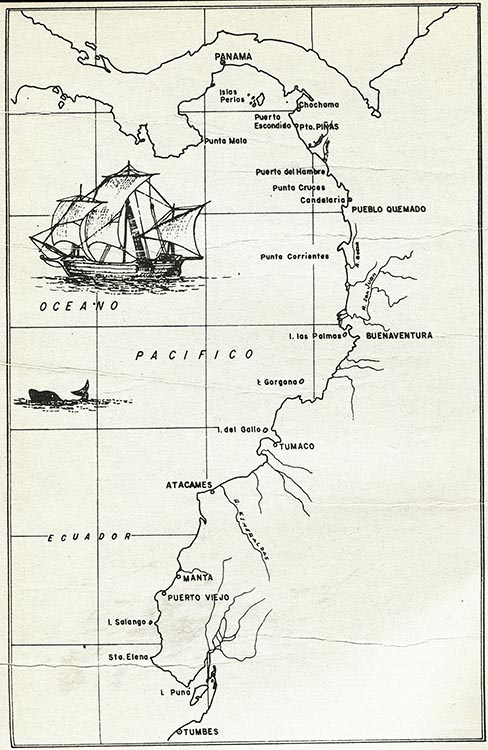 On December 27, 1530, the flags were blessed in Panama’s main church. The following day, Pizarro called for sailing within the next few weeks, and on January 20, 1531, they sailed to the Pearl Islands and then headed south with a good sea and winds. Besides its crew, there were 180 soldiers, support personnel, 36 horses, and war dogs. The second ship under Captain Cristóbal de Mena’s command was ordered to follow in early February.