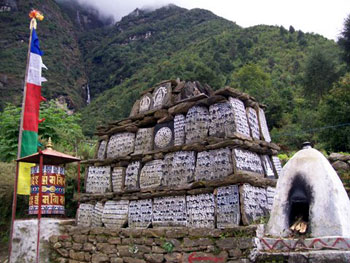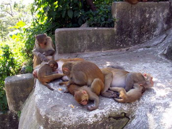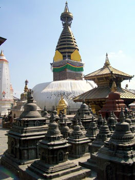 So after relaxing for a day we took a taxi (200 rupees) from the hotel up to the temple steps (365 in all). There is a small entrance fee to the main complex, which has several temples, chaityas, shrines, prayer wheels, shops, stalls; and yes, lots of monkeys. It also provides a bird’s eye (and several buzzards were sharing the air space) view of the Kathmandu Valley. The blue (sky/space), white (air/wind), red (fire), green (water) and yellow (earth) prayer flags that had provided welcome colour on trek peaks stretch out in all directions from the main stupa dome. The prayers written on the flags are supposed to be carried around the world on the wind, and on that clear sunny day it was not difficult to imagine them being conveyed up and over the holy mountains to the trekkers’ Shangri-la in the north.
