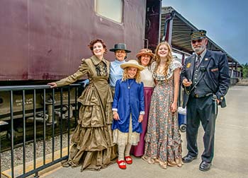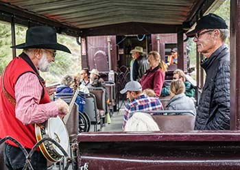Dressed to match the times, Felix, a delightful banjo-playing songster, kicks off in our section with some classic favourites, ‘I’ve Been Working on the Railroad’ and ‘You are my Sunshine’. Requests are welcomed as he wanders through the cars. And he can pretty much play any tune asked for. Conductor Ron, provides educational and humourous commentary as we snake along the route.