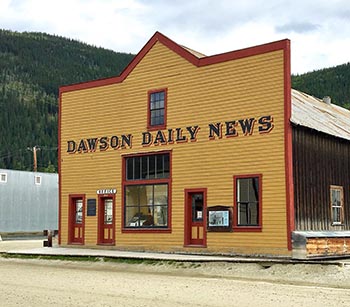 After looking at some “old mail” packages and envelopes and some post office public notices on the walls, we headed down the street to the Dawson Daily News – or what used to be the city’s newspaper office and presses. After checking out the press equipment used to print the day’s news, we had the opportunity to read some actual newspapers that were published on the very day we were visiting – but back in the early 20th century. Very interesting reading about items like the “recent Wall Street slump” and news of the Kaiser from Europe (this was before The Great War, remember). Even the ads were quite interesting: white golf sweaters for women, travel ads for rail lines and steamships, and food ads for products like “Juicy Clark’s Pork and Beans.”