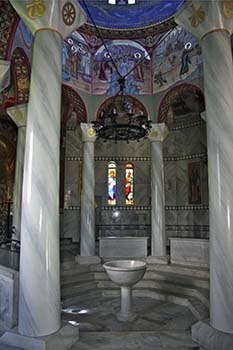 Paul spread the good news in Philippi and baptised his first convert, a business woman named Lydia, in the Gangites River just outside the city (Acts 16:14-15). The Baptistry of St. Lydia, located near the river, commemorates the event. Inside, I was overwhelmed by the colourful icons and mosaics on the walls, arches and ceiling depicting scenes from the life of St. Paul. At the center of the octagonal interior, right under the dome, is a whitish gray baptismal font used for infant baptisms (adults are baptised in the river).