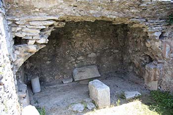 Paul and his companions were beaten and sent to the inner prison (Acts 16:23-24). The traditional site of Paul’s prison cell is the arched Roman cistern set under the atrium of the late 5th century CE structure known as Basilica A. Looking down inside you find a small column section and several stone blocks. The right side-wall may have been decorated with a fresco at one time.