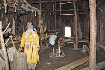 She stood in front of a 3-foot high shelf, fashioned from tree branches, running along the length of the wall. The shelf served as a bed platform for the residents after it was covered with animal skins. This longhouse would have accommodated as many as 12 families (60 to 80 people).